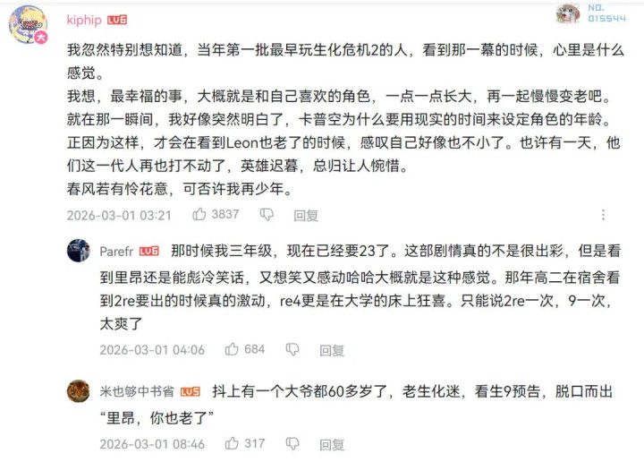 9代,里昂重新回到了浣熊市警员局,看到落在地上,拼错的WELLCOME横幅,向隐藏已久的“战友”们报到。我在B站的这段切片下,看到有年青玩家说,我方仅仅玩过重制版的二代,就被打动了,难以设想最早那批玩生化2的东说念主,在这一幕感受到的是什么。