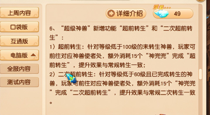 关于低于100级的未转生神兽,可以寥落浮滥15个神兜兜完成超前转生。关于低于60级且已完成转生的神兽,可以浮滥寥落15个神兜兜完成二次超前转生。