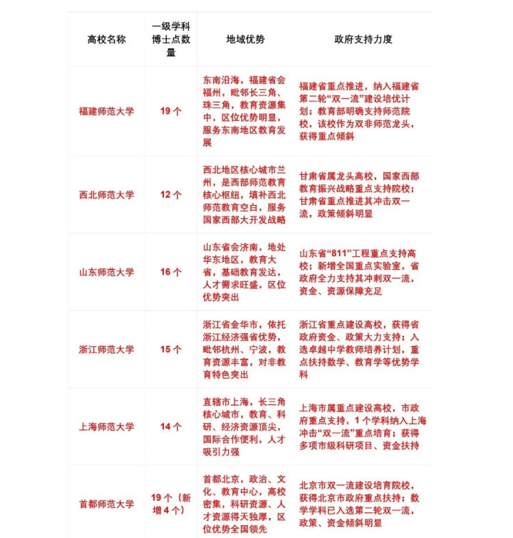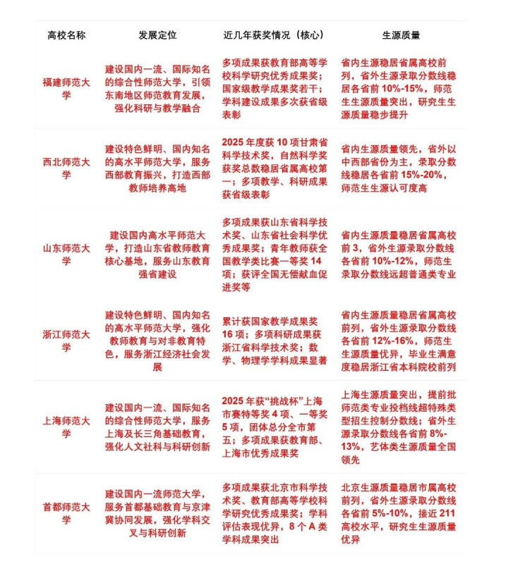 本文将先对6所高校进行综合性先容,再从多维度全靠近比分析,通过表格直不雅呈现差距,最终预测各校入选概率并名次,为民众解锁最具后劲的师范高校。