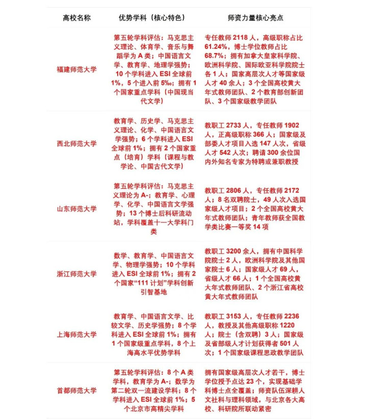 6所高校均为各省师范类龙头院校,深耕师范造就限制多年,但凭借不同的地域上风、学科特点,酿成了各自的发展形状,中枢亮点各有侧重。