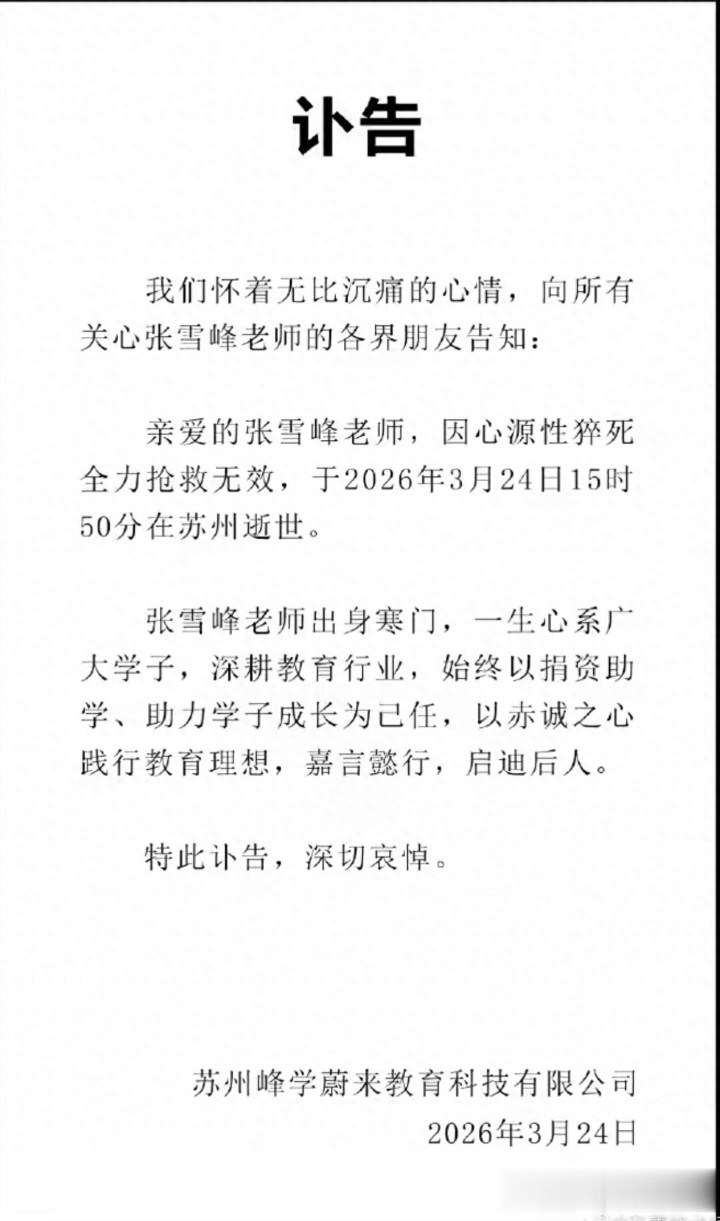 据苏州峰学蔚来教导科技有限公司发布的讣告,3月24日中午,张雪峰在公司内进行日常跑步检会后,突发躯壳不适,共事难题将其送医。尽管病院动用了ECMO体外膜肺氧合等先进建筑,仍未能转圜他的人命。当日15时50分,这位教导界的“段子手”始终闭上了眼睛。