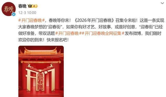 不外即便这么,全球每年对春晚的期待如故一如既往。 毕竟春晚也曾成了每个东说念主心中春节的具象化发达,对全球来说都有着出奇的兴趣兴趣。 是以当2026年春晚官宣《开门迎春晚》这个行动的时候,全球都很骇怪。